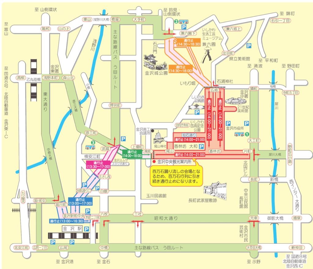 JR「金沢駅」から行列コース各所までは徒歩もしくはバス