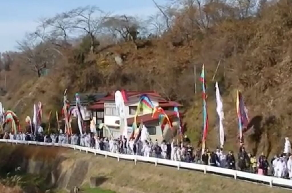 福島県二本松市で毎年師走に開催される『木幡の幡祭り』は、阿武隈の山間を彩る壮大な伝統行事です。五色に輝く五反幡をはじめ、約百本もの幡が一斉に押し立てられ、法螺貝の響きとともに山道を進むその光景は、まさに圧巻。参加者や見物客の心を引きつける、冬の風物詩となっています。